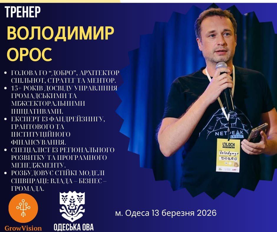 Володимир Орос — голова ГО "Добро", архітектор спільнот та стратег, має понад 15 років досвіду у фандрейзингу та управлінні міжсекторальними ініціативами.