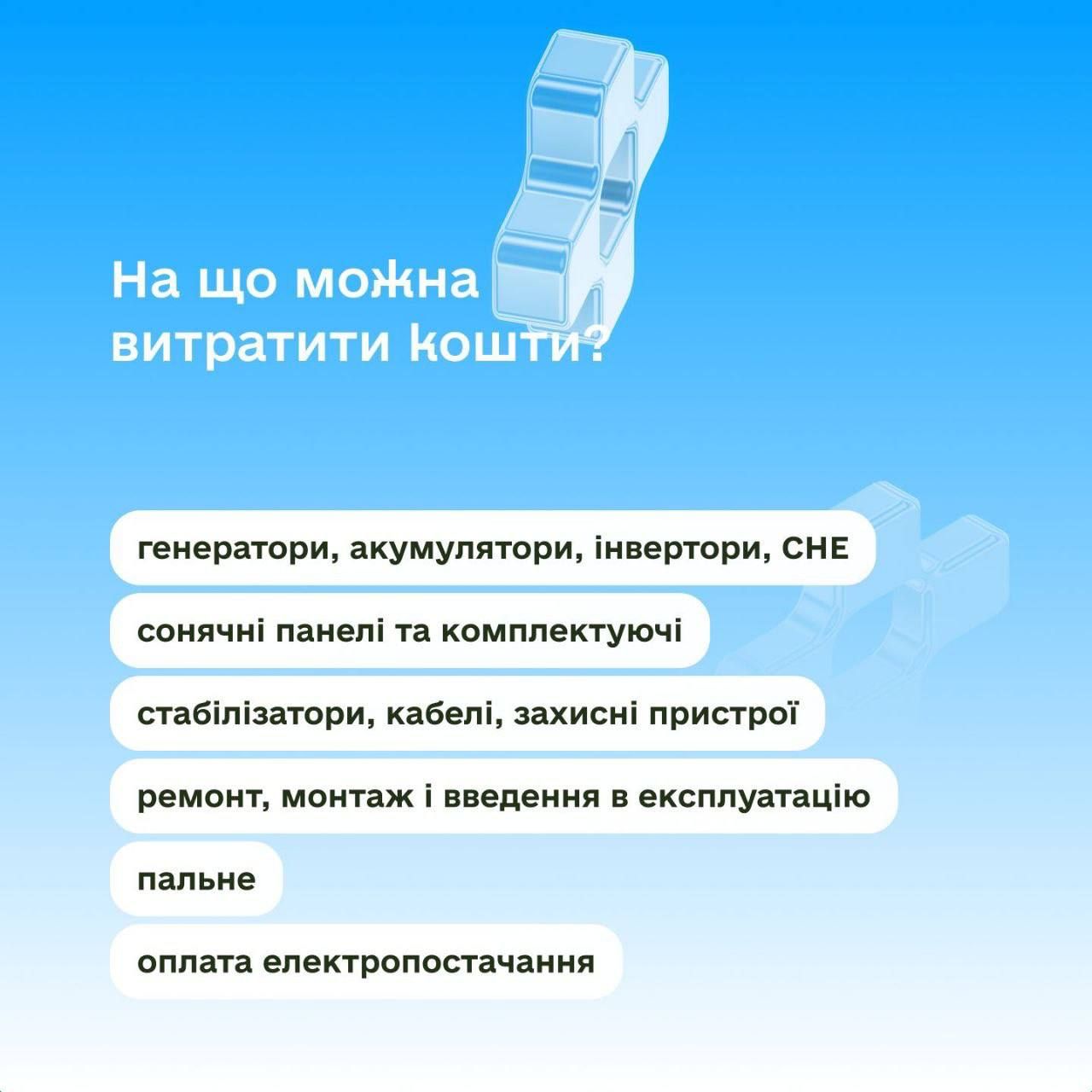 Кошти можна спрямувати на забезпечення роботи під час відключень електроенергії: придбання або ремонт генератора чи іншого енергообладнання, пальне для генератора або оплату комунальних послуг.