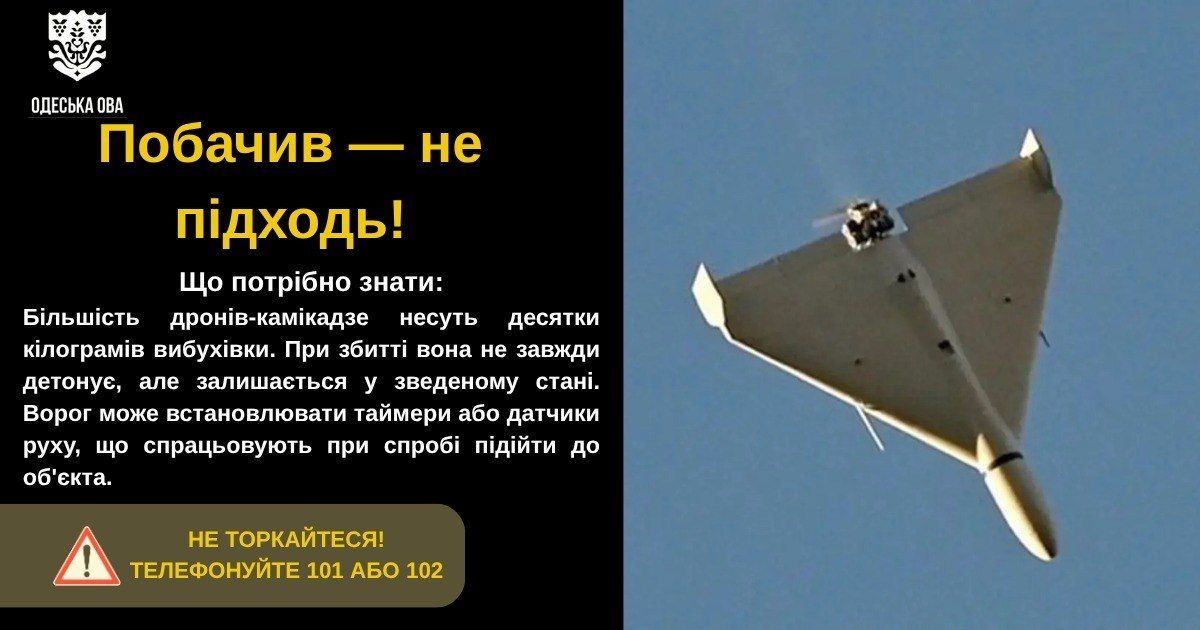 Що важливо знати Більшість дронів-камікадзе містять значну кількість вибухових речовин. Після збиття вони не завжди детонують і можуть залишатися небезпечними. Також можливе встановлення таймерів або датчиків руху, які спрацьовують при наближенні чи дотику.